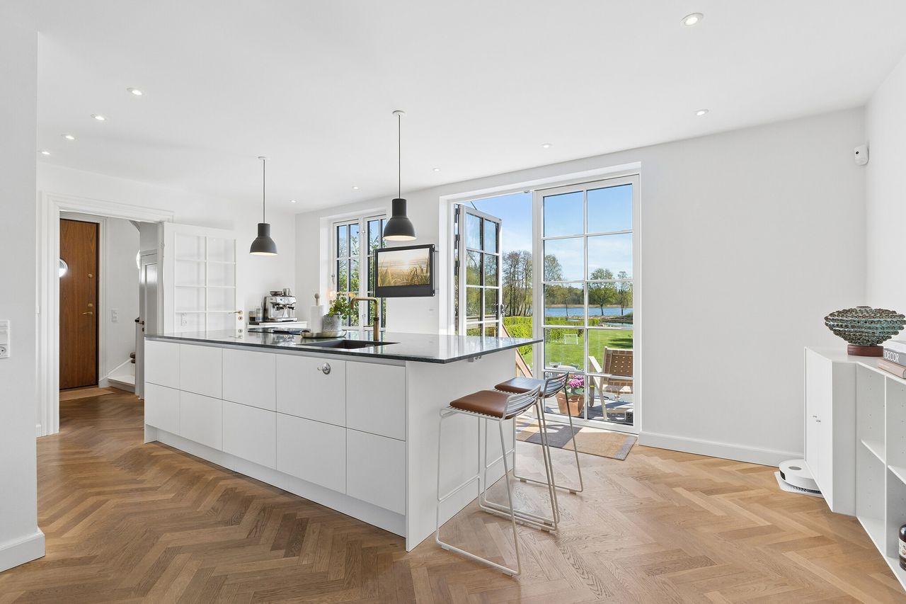 Indenfor har huset gennemgået en større renovering med stor respekt for husets sjæl, hvor der blandt andet i stueplan er massive sildebensparket med gulvvarme, samt Vola armaturer og Arne Jacobsen dørhåndtag. På stueplan får du et moderne køkken fra Svane, hvor der er en stor køkkenø og alt, du har brug for i hvidevarer. Herfra oplever du den skønne udsigt, du har over Lyngsø. Derudover er der udgang til en stor terrasse herfra. I forlængelse af køkkenet finder du spiseafdelingen og opholdsstue i vinkel. Her er der rummeligt, højt til loftet og lys. Desuden byder stueetagen også på gæstetoilet.