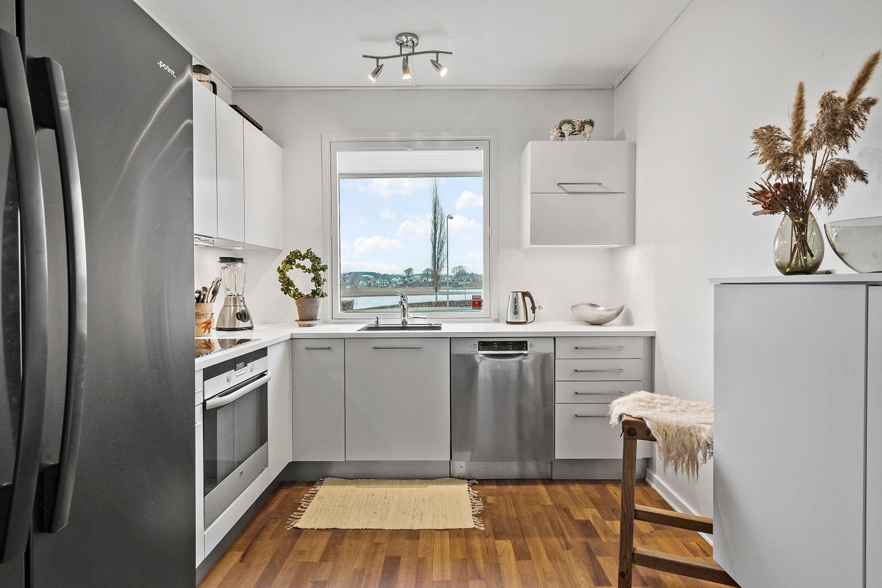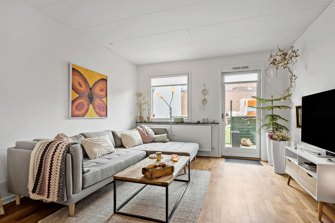 Når du træder indenfor, kommer du ind i en rummelig entré, hvorfra du har adgang til alle lejlighedens værelser og badeværelse. Du får to gode værelser med god skabsplads, et badeværelse samt et stort køkkenalrum med stue i forlængelse. I køkkenet finder du et moderne køkken med alt, du har brug for i hvidevarer. I alrummet og stuen, har du masser af plads til et stort spisebord og sofaarrangement. Herfra har du også udgang til din egen skønne terrasse, som ligger ud til et lille grønt areal.