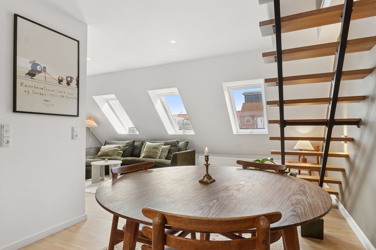 Lejligheden her byder på et stort køkkenalrum med et stilrent køkken, samt god plads til spiseafdeling. I forlængelse af køkken alrummet finder du en hyggelig stue, samt kontorplads. Her er der masser af godt lysindfald fra de mange ovenlysvinduer. Bevæger du dig op af trappen kommer du op til en rummelig hems, hvor der er plads til dobbeltseng, opbevaring og ikke mindst en skøn detalje med ovenlysvindue, der kan foldes ud til en tagaltan. Lejligheden rummer også en entré og badeværelse med gulvvarme.